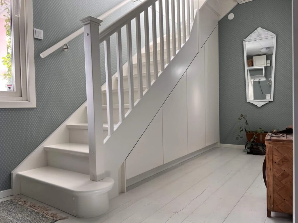 Perfekt för trånga hallar med möjlighet till klädstänger och förvaringslådor. Passar inte bara för nya trappor utan kan även beställas till befintliga. Vi har lösningar på en innovativ garderobsförvaring under trappan. Varje kvadratmeter används optimalt med stil.