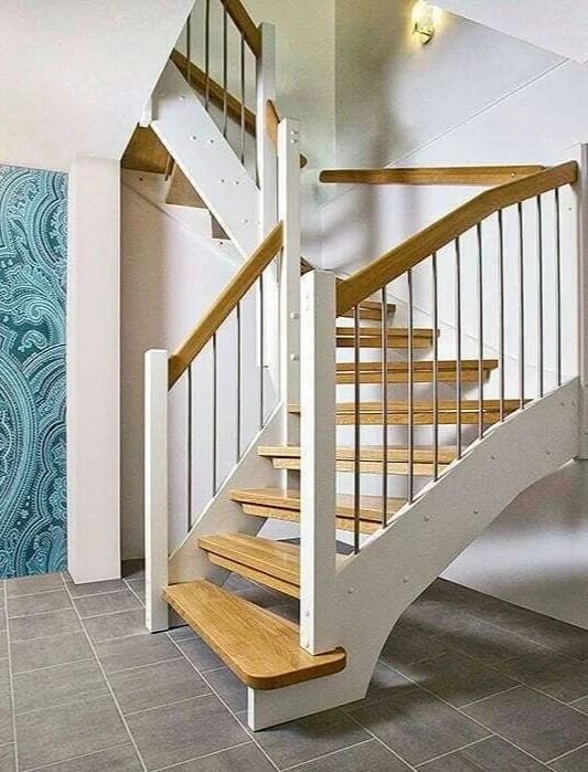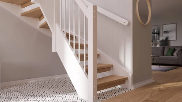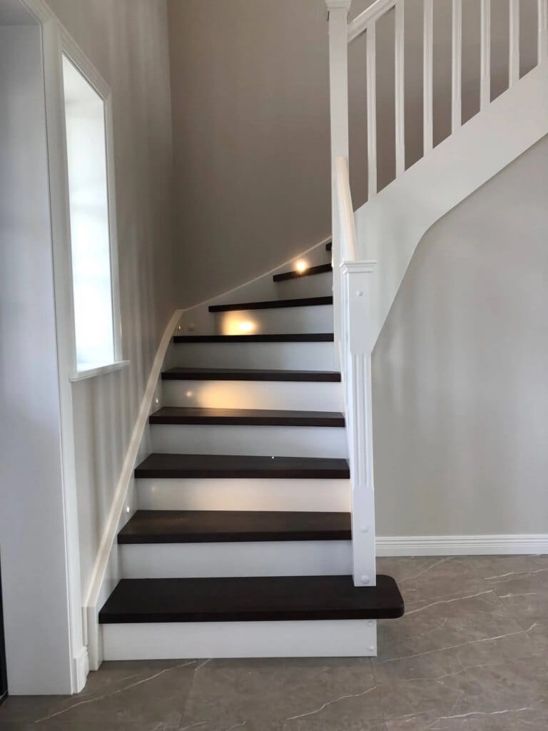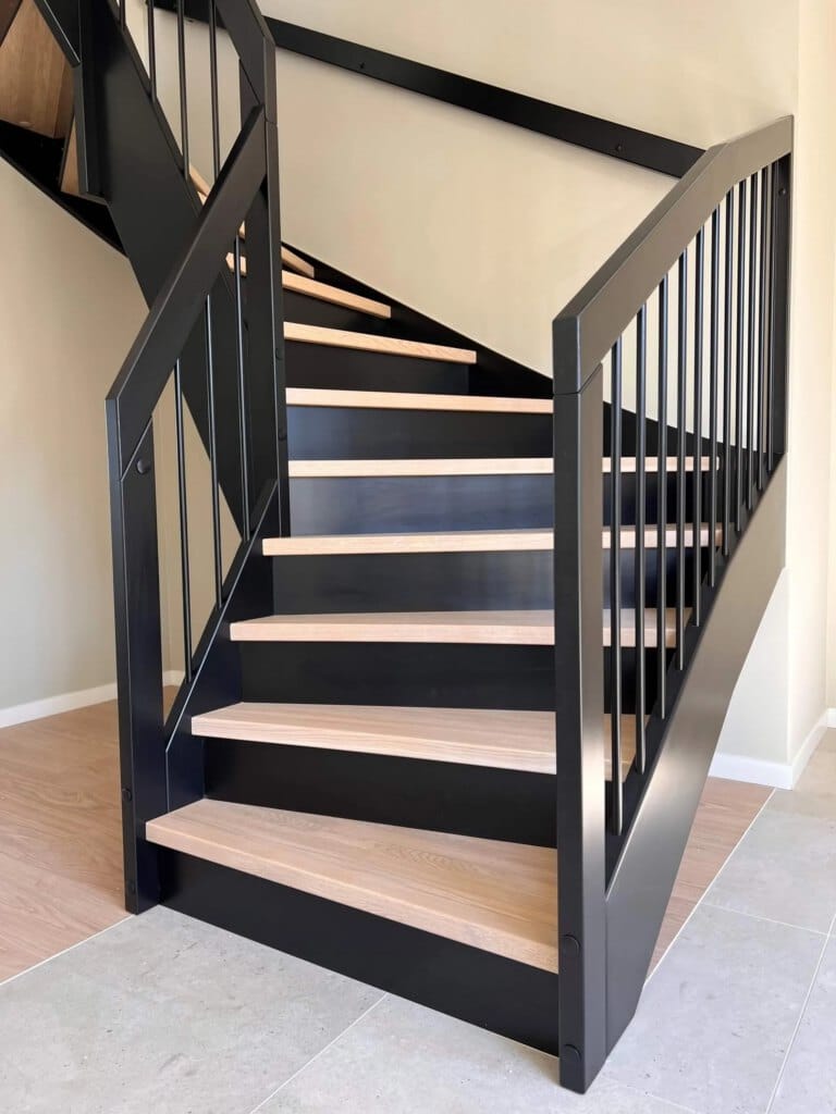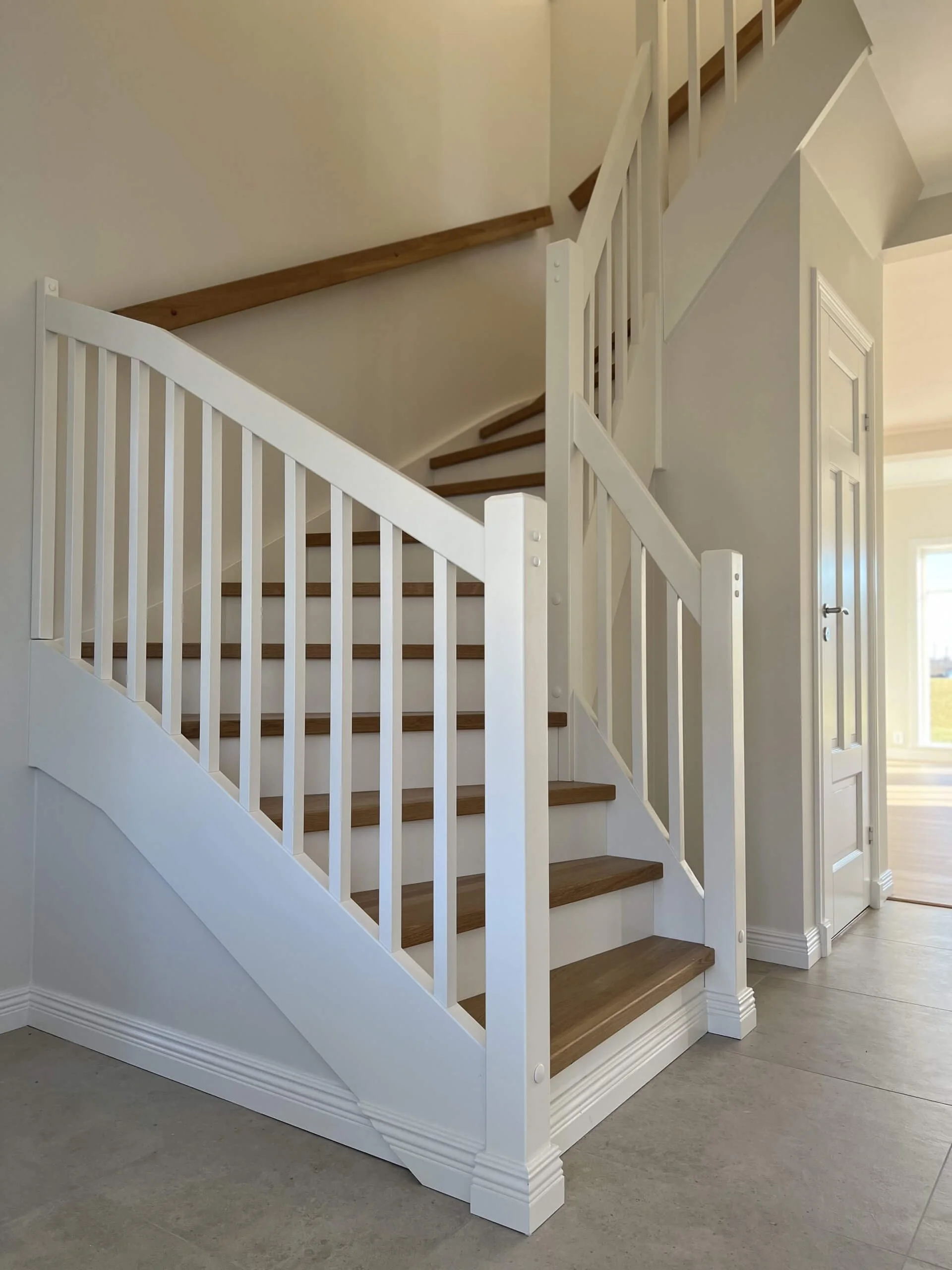 En trappa med moderna former och traditionella stildrag. En trappa med rak sidovagn som kan fås både tät och öppen.